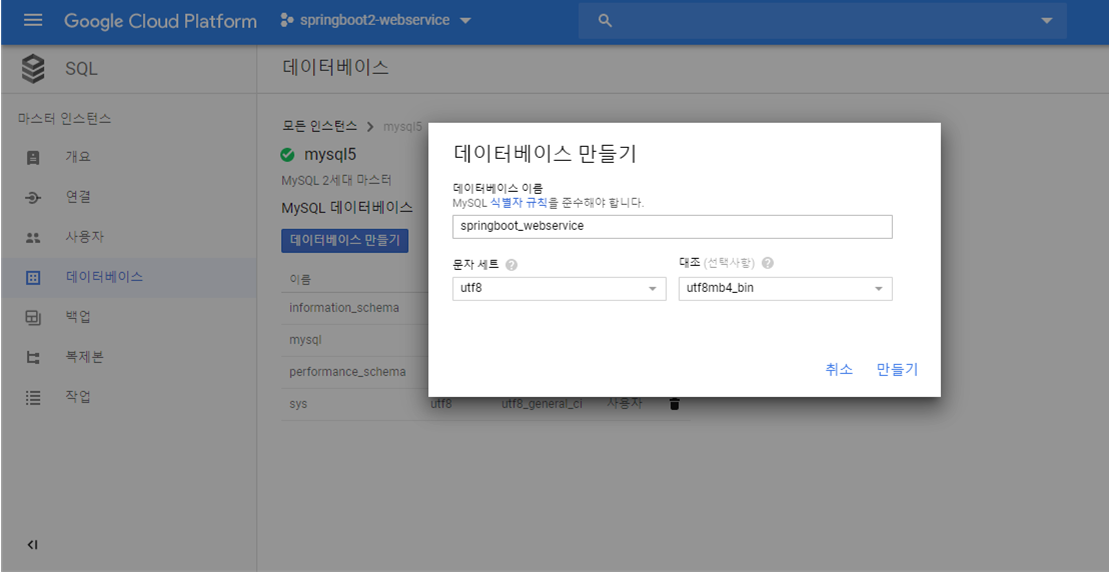 2. 생성된 DB Instance 내 Schema 만들기 : [SQL] > [데이터베이스] > 생성한 VM 선택 > [데이터베이스 만들기]