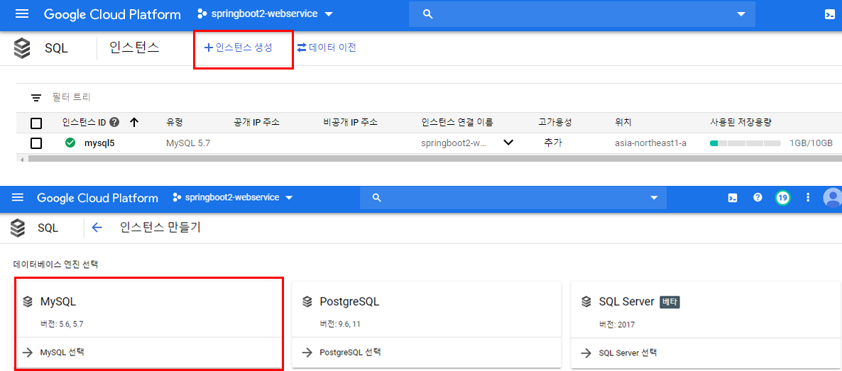 1. MySQL Instance 생성: [SQL] > [데이터베이스] > [인스턴스생성] > [MySQL]