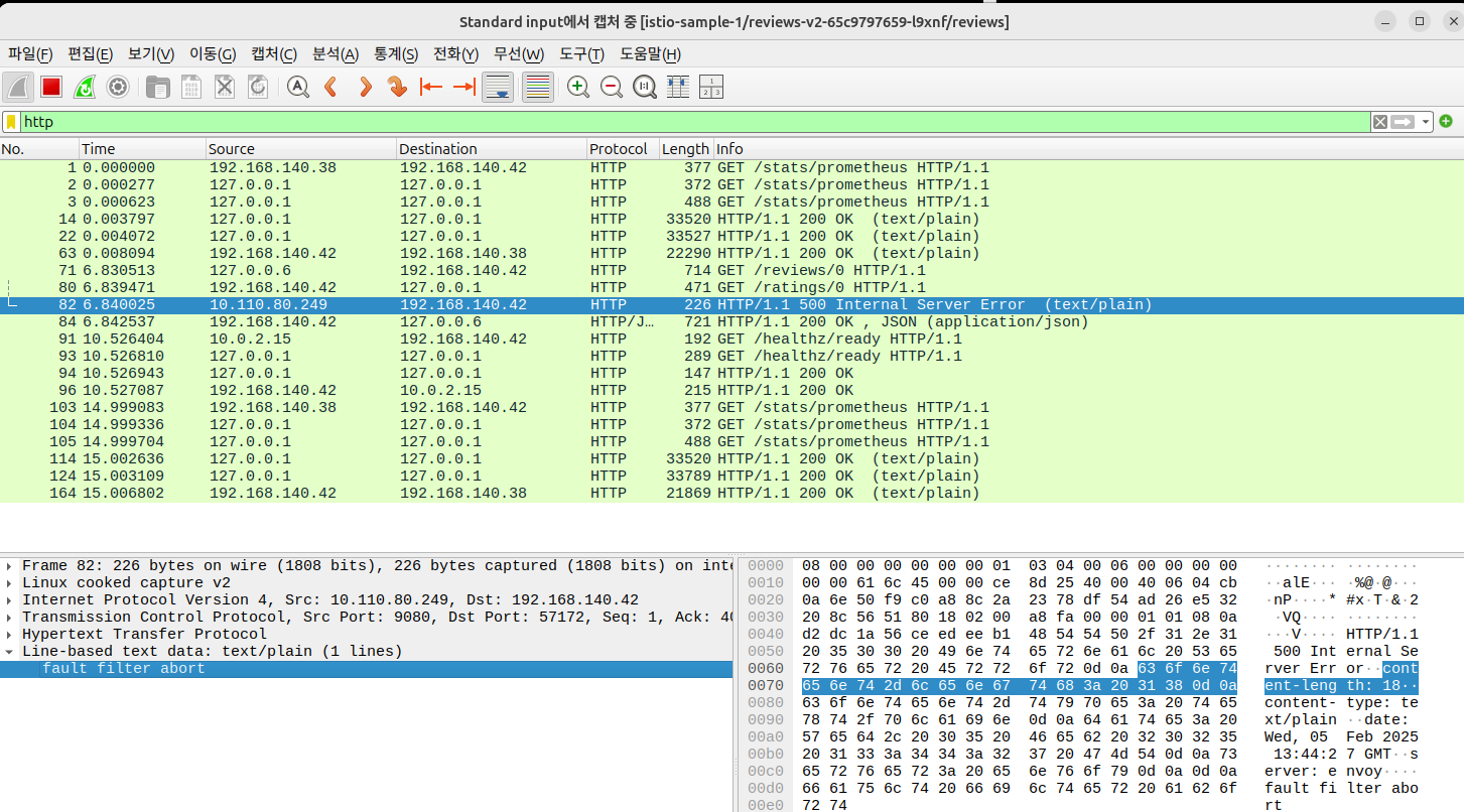 istio-inject된 namespace에서의 pod와 그렇지 않은 pod에서의 요청이 다르다.